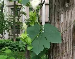 王瓜〔学名:Trichosanthes cucumeroides (Ser.)Maxim.〕:葫芦科,栝楼属多年生草质藤本植物。纸质叶片,轮廓阔卵形或圆形,叶基深心形,上面深绿色,背面淡绿色,细脉网状;叶柄纵条纹,花雌雄异株。花梗短,稀无小苞片;花萼筒喇叭形,花冠白色,花丝短,雌花单生,子房长圆形,花萼及花冠与雄花相同。果实卵圆形、5-8月开花,8-11月结果。