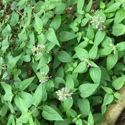 亚灌木状草本,高可达90厘米。茎钝四稜形,具浅槽,无毛。叶卵圆形或三角状卵圆形,长2.5-7厘米,宽2-4.5厘米,先端渐尖,基部截形或圆形,稀钝,边缘具锯齿,上面绿色,下面较淡,两面无毛,下面具腺点;茎生叶叶柄长3-4.5厘米,无毛。