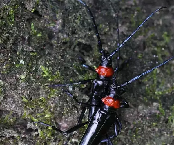 成虫:体黑色,有光亮;前胸背板红色,背面有4个光滑疣突,具角状侧枝刺;鞘翅翅面光滑,基部比前胸宽,端部渐狭;雄虫触角成虫 有两种色型:一种是身体黑色发亮和前胸棕红色的“红颈型”,另一种是全体黑色发亮的“黑颈”型。据初步了解,福建、湖北有“红颈”和“黑颈”两型的个体,而长江以北如山西、河北等地只见有“红颈”个体。成虫体长约28-37毫米,体黑色发亮,前胸背面大部分为光亮的棕红色或完全黑色。头黑色,腹面有许多横皱,头顶部两眼间有深凹。触角蓝紫色,基部两侧 各有一叶状突起。前胸两侧各有刺突一个,背面有4个瘤突。鞘翅表面光滑,基部较前胸为宽,后端较狭。雄虫身体比雌虫小,前胸腹面密布刻点,触角超过虫体5节;雌虫前胸腹面有许多横皱,触角超过虫体两节。