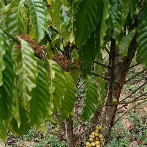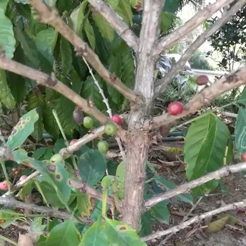 1、咖啡炭疽病的症状:主要发生在叶片、果实、枝条上。叶片感病后,上下表面均有淡褐色病斑,直径3毫米左右,中心灰白色,边缘黄色,后期完全变成灰色,有同心轮纹排列的黑色小点,病斑多在叶缘。枝条感病后产生褐色斑,最后引起枝条回枯,果实感病后形成僵果,果肉变硬,紧贴于种豆上,果皮上有紫色病斑,严重时落果。