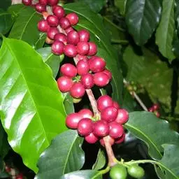 大粒咖啡(学名:Coffea liberica Bull ex Hiern)茜草科植物,小乔木或大灌木,高6-15米;枝开展。叶薄革质,椭圆形、倒卵状椭圆形或披针形,顶端阔急尖,基部阔楔尖,全缘,两面无毛,下面脉腋有小窝孔,窝孔内具短丛毛;侧脉每边8-10条;叶柄粗壮;托叶基部合生,阔三角形,顶端钝,罕有凸尖。聚伞花序短小,2至数个簇生于叶腋或在老枝的叶痕上,有极短的总花梗;苞片合生,二型,通常2枚阔卵形,顶端截平。花未见。浆果大,阔椭圆形,成熟时鲜红色,顶端冠以宽4-7毫米、凸起的花盘;种子长圆形,直径约10毫米,平滑。花期1-5月。