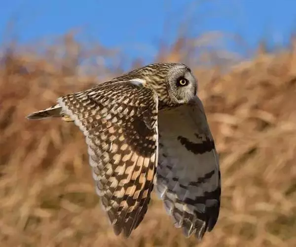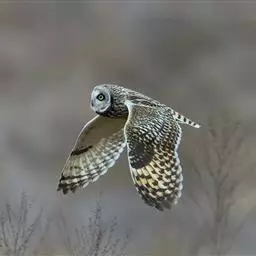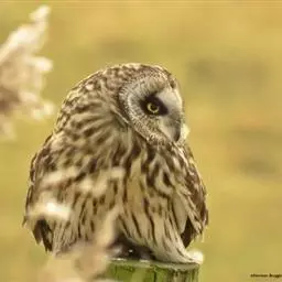 短耳鸮(学名:Asio flammeus)是鸮形目鸱鸮科的鸟类。体矮,体长约38-40厘米,黄褐色鸮鸟。翼长,面庞显著,短小的耳羽簇于 野外不可见,眼为光艳的黄色,眼圈暗色。上体黄褐,满布黑色和皮黄色纵纹;下体皮黄色,具深褐色纵纹。飞行时黑色的腕斑显而易见。栖息于开阔田野,白天亦常见。成群营巢于地面。以小鼠、鸟类、昆虫和蛙类为食。是分布最广的鸮类之一,分布自北极的周围到北温带,见于夏威夷和南美洲的大部分地区,可迁徙到更南的地方。