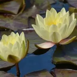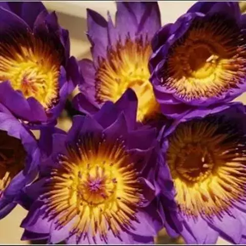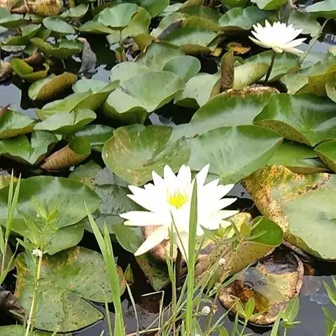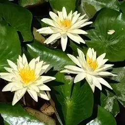 埃及白睡莲(N. lous):原产埃及尼罗河,花径20~25cm,大花型,挺水开放。花色白,花瓣20~25 枚,长卵形,端部圆钝。萼片绿色,脉纹明显。花梗、叶梗绿色有柔毛。叶径42~40 cm,叶面绿色,叶背微红,叶缘波状有锯齿。雄蕊淡黄色,70~100 个。蓝睡莲(N. caeruloa):原产北非、埃及、墨西哥。花径15~20 cm,大花型,挺水开放。花瓣16~20枚,花开呈星状。花梗、叶梗淡红棕色。叶径32~30cm,叶面绿色,叶背暗红紫色,有紫色小斑块,叶缘略微波状,叶基深裂。雄蕊80~100 个。