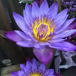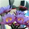 埃及蓝睡莲(N. stellata):又称星形睡莲或延药睡莲,原产印度及东南亚,国内分布于云南南部、海南岛。花径15~18 cm,大花型,挺水开放,花开呈星状,有香气。花瓣15~18 枚,顶端尖锐,深蓝色,中下部淡蓝色,萼片背面有墨紫色斑点。花梗、叶梗绿色。叶径34~32 cm,叶面绿色有紫斑,叶背有深紫色斑点,叶缘全缘。雄蕊70~100 个,花丝扁平,端部淡蓝色,结实能力极强。