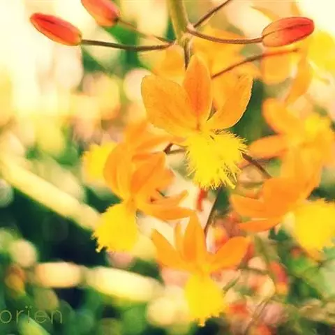 独角石斛,Dendrobium unicum,兰科石斛属植物。花瓣橙黄色,唇瓣反转似犀牛角,…