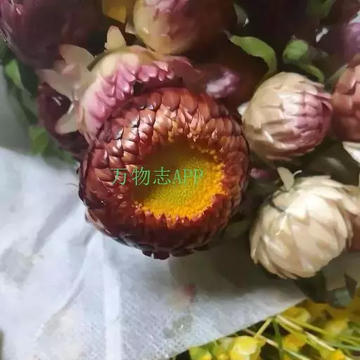 头状花序径2-5厘米,单生于枝端。总苞片外层短,履瓦状排列,内层长,宽披针形,基部厚,顶端渐尖,有光泽,黄色或白、红、紫色。小花多数;冠毛有近羽状糙毛。瘦果无毛。