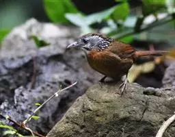 大噪鹛:中型鸟类,体长32-36厘米。额至头顶黑褐色,背栗褐色满杂以白色斑点,…