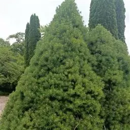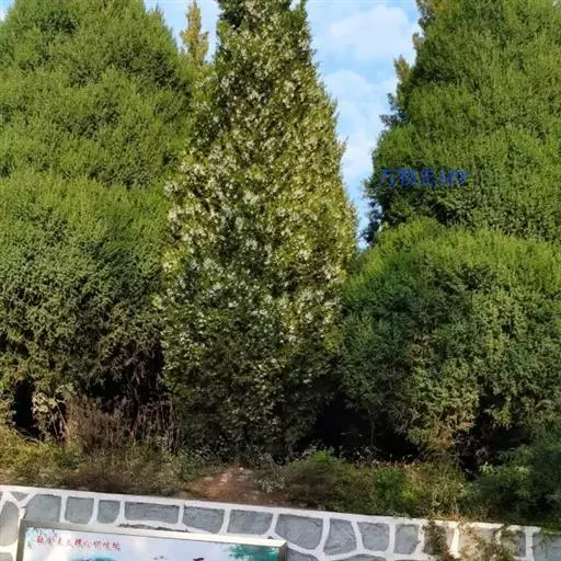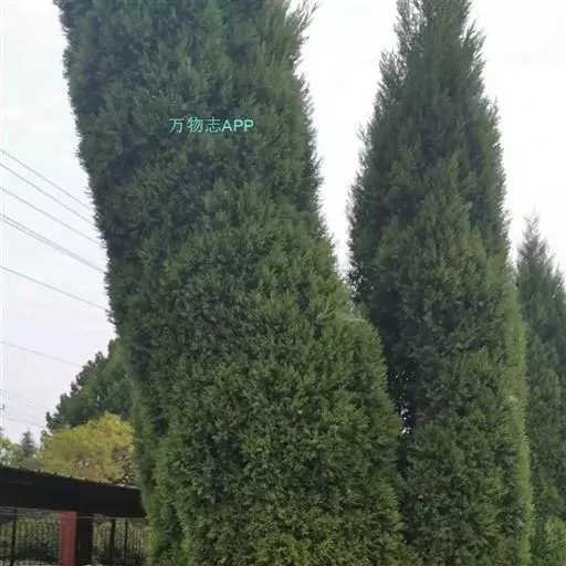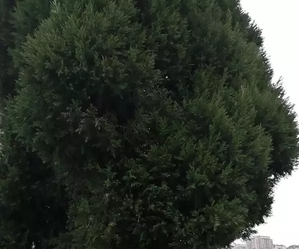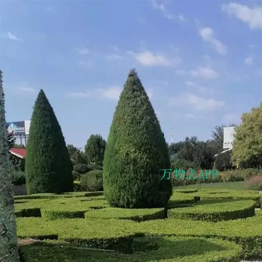 4、龙柏(cv.Kaizuka)树形不规正,枝交错生长,少数大枝斜向扭转,小枝紧密多为鳞叶,仅有时几部萌生糵枝上有钻形叶。树冠圆柱状或柱状塔形;枝条向上直展,常有扭转上升之势,小枝密、在枝端成几相等长之密簇;鳞叶排列紧密,幼嫩时淡黄绿色,后呈翠绿色;球果蓝色,微被白粉。长江流域及华北各大城市庭园有栽培。