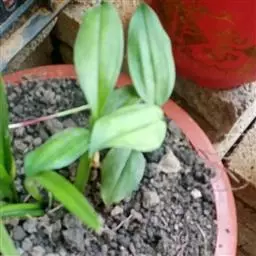 方法一 准备好兰盆及植料后,将兰株倒拿(根在上,叶在下)放于水龙头下以慢水冲洗,但水压切忌过强,以免伤兰根及叶子。用拇指和食指抓住兰头,小指抵住盆缘,用竹筷将根固定,当放入盆内时,尽量不要让根接触到盆壁。将豆粒大的混合石砾倒入盆底至三分之一处。然后倒入中粒植料至五分之四处,填实和尽量不要留下空间。将竹筷拔出,并摇实盆中植料。填实植料后,再用大粒植料埴入至距盆缘1.5厘米处。最后再倒入豆粒大植料,以将假鳞茎全部埋入土中为度,然后充分摇实。用压土工具轻压植料,并将表面弄平。种植完毕后,植料在盆中以中央稍高为好。