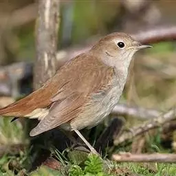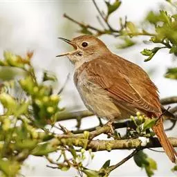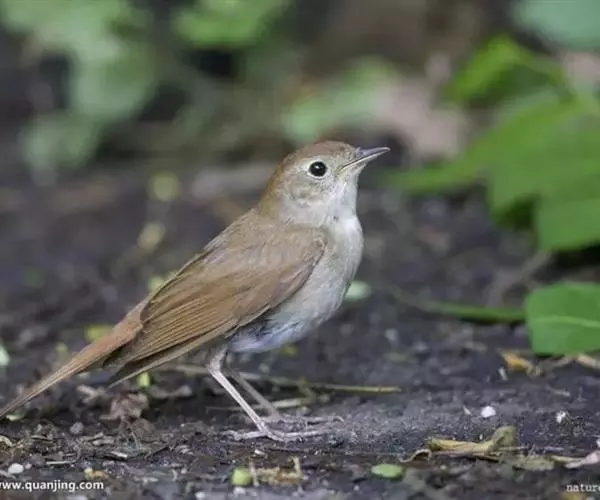 夜莺体色灰褐,羽色并不绚丽,但鸣唱非常出众,音域极广,是玩赏鸟的种类之一。