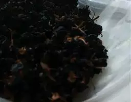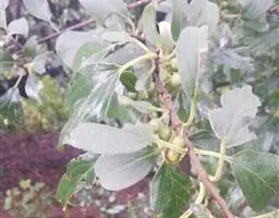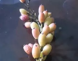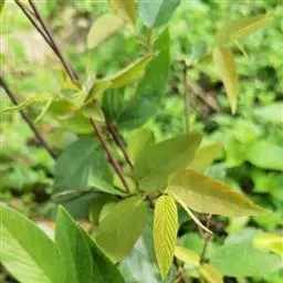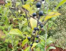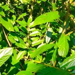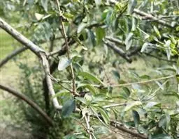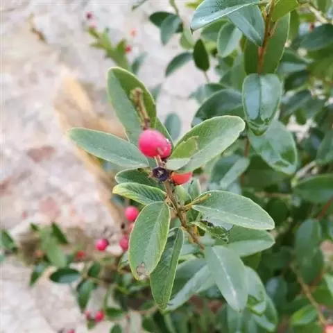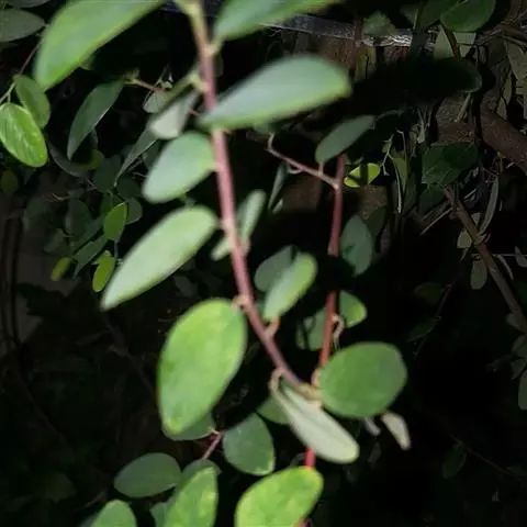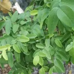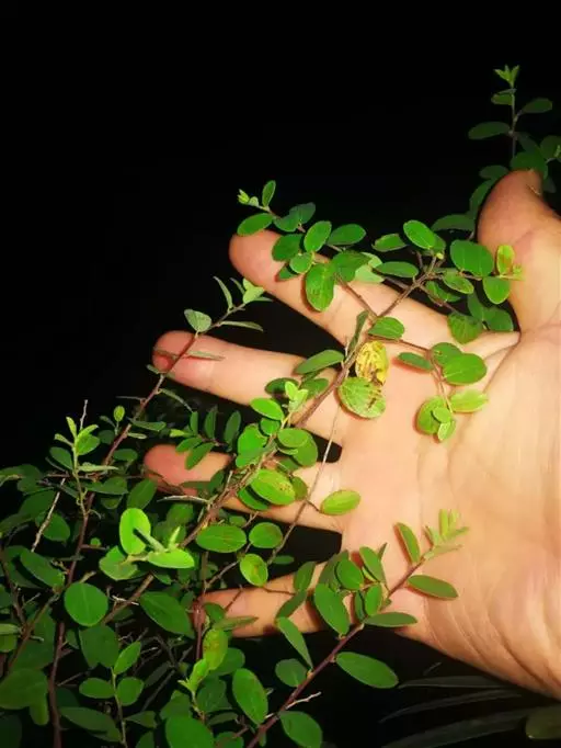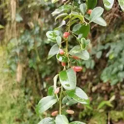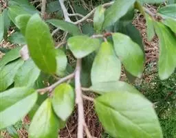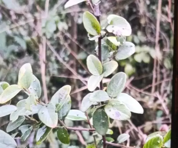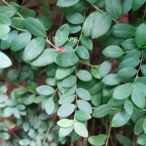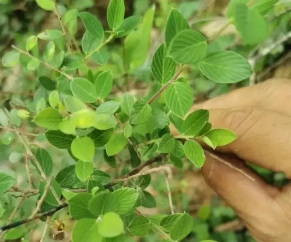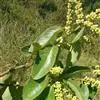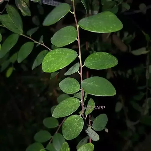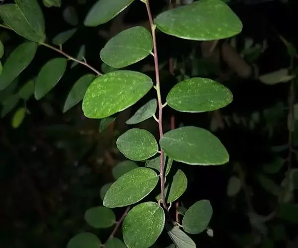 (2)光枝勾儿茶茎呈圆柱形,直径可达1.5cm。表面棕褐色至暗紫色,外被蜡质;质坚硬,难折断,断面不整齐,皮部薄,木部浅黄色,髓明显。叶互生,有短柄,叶片卵圆形,长2-4cm,宽1-2cm,先端渐尖或钝圆,项处有芒尖,全缘;上表面灰绿色,下表面黄绿色,羽状侧脉7-9对;叶近革质。气微、味微苦涩。