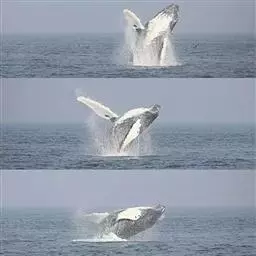 露脊鲸体型肥大短粗,头略超过体长的1/4,上颌细长向 露脊鲸 下弯曲呈拱状,下颌两侧向上突出。上颌前端顶部有一个较大的椭圆形角质瘤,在呼吸孔前方及上下颌两侧也各生有一列较小的角质瘤。无背鳍,鳍肢短宽,尾鳍幅宽几达体长的1/3。体腹面平滑无褶沟,背部黑色,腹部色淡,在脐前后有不规则白斑,鳍肢和尾鳍上下方皆黑色。鲸须狭长而柔软,每侧220~260片,须长达2.9米,须板与须毛皆黑色 成体体长17米,雌性比雄性大,体重40~100吨。