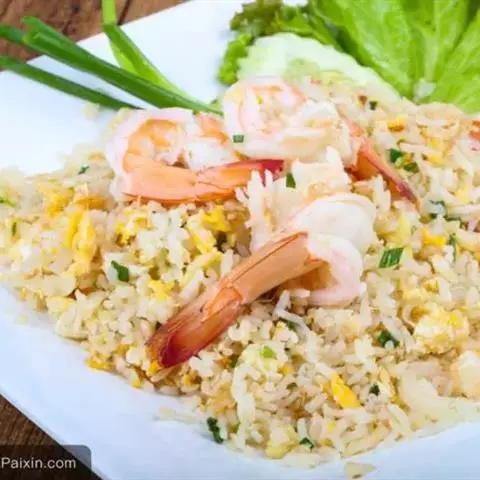 菠萝炒饭是将带皮菠萝纵切,用勺子将菠萝肉取出,切成小丁,…