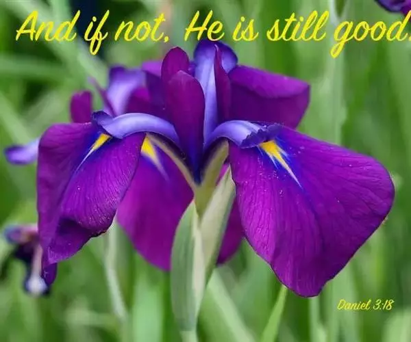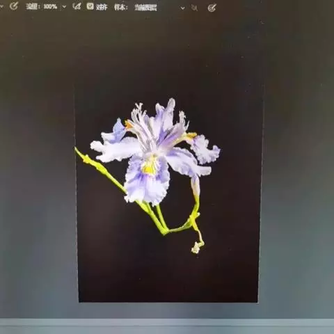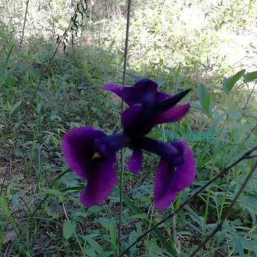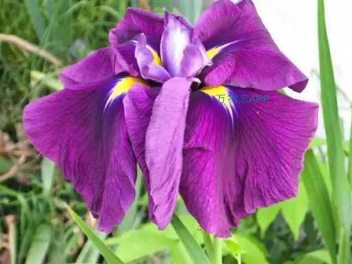 花茎圆柱形,高40-100厘米,实心,有1-3枚茎生叶;苞片3枚,近革质,披针形,长4.5-7.5厘米,宽0.8-1.2厘米,顶端急尖、渐尖或钝,平行脉明显而突出,内包含有2朵花;花深紫色,直径9-10厘米;花梗长1.5-3.5厘米;花被管漏斗形,长1.5-2厘米,外花被裂片倒卵形,长7-8.5厘米,宽3-3.5厘米,爪部细长,中央下陷呈沟状,中脉上有黄色斑纹,内花被裂片小,直立,狭披针形或宽条形,长约5厘米,宽约5-6毫米;雄蕊长约3.5厘米,花药紫色,较花丝长;花柱分枝扁平,长约5厘米,宽0.7-1厘米,紫色,略呈拱形弯曲,顶端裂片三角形,有稀疏的牙齿,子房圆柱形,长1.5-2 厘米,直径约3毫米。
