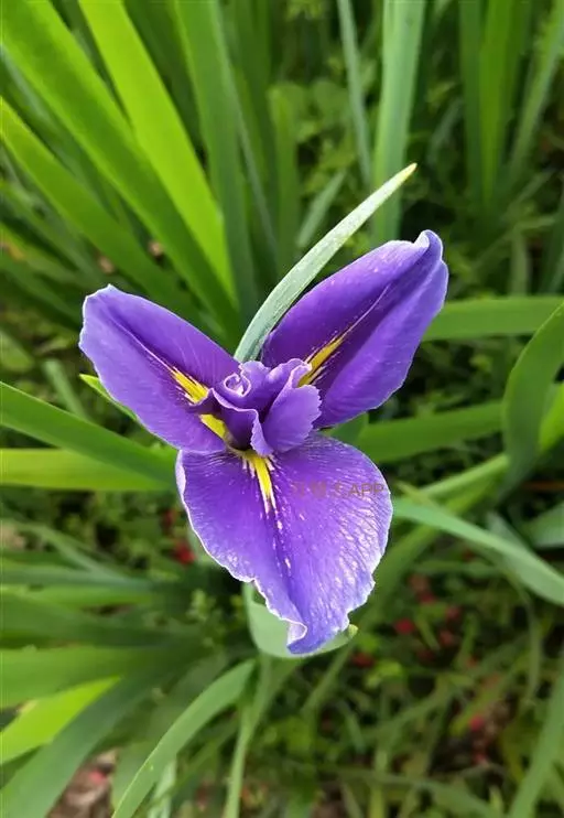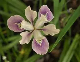 双色野鸢尾为多年生草本植物,叶子呈剑状淡绿色。…