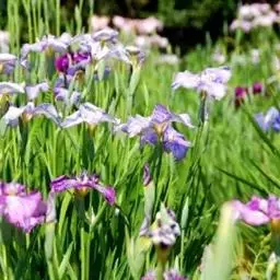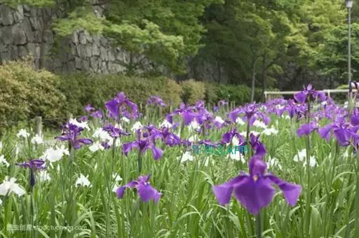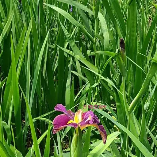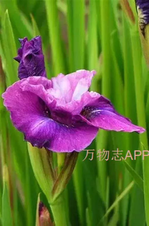 玉蝉花(Iris ensata Thunb. ):多年生草本,植株基部围有叶鞘残留的纤维。根状茎粗壮,斜伸,外包有棕褐色叶鞘残留的纤维;须根绳索状,灰白色,有皱缩的横纹。叶条形,两面中脉明显。花茎圆柱形,实心,有1-3枚茎生叶;苞片3枚,近革质,披针形,内包含有2朵花;花深紫色,直径9-10厘米;外花被裂片倒卵形,内花被裂片小,直立,狭披针形或宽条形。蒴果长椭圆形,顶端有短喙,6条肋明显,成熟时自顶端向下开裂至1/3处;种子棕褐色,扁平,半圆形,边缘呈翅状。花期6-7月,果期8-9月。