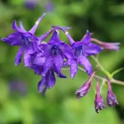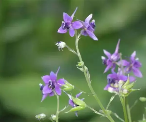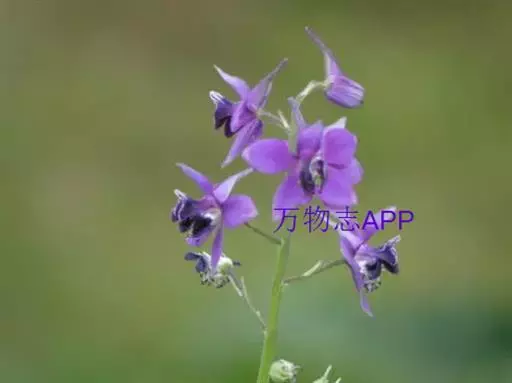 总状花序有(1-)2-15花;轴和花梗被反曲的短柔毛;基部苞片叶状,其他苞片小,披针形至披针状钻形,长2.5-4.5毫米;花梗长0.4-1.2厘米;小苞片生花梗中部,披针状线形,长2.5-4毫米;花长1-1.8(-2.5)厘米;萼片堇色或紫色,椭圆形至长圆形,长6-9(-11)毫米,外面疏被短柔毛,距钻形或圆锥状钻形,长5-9(-15)毫米,稍向上弯曲或近直;花瓣紫色,无毛,上部变宽;退化雄蕊与萼片同色,无毛,瓣片斧形,二深裂近基部;雄蕊无毛;心皮3,子房疏被短柔毛或近无毛。