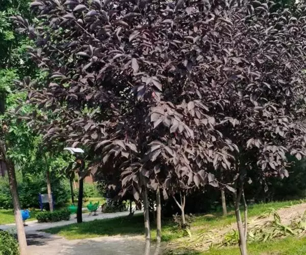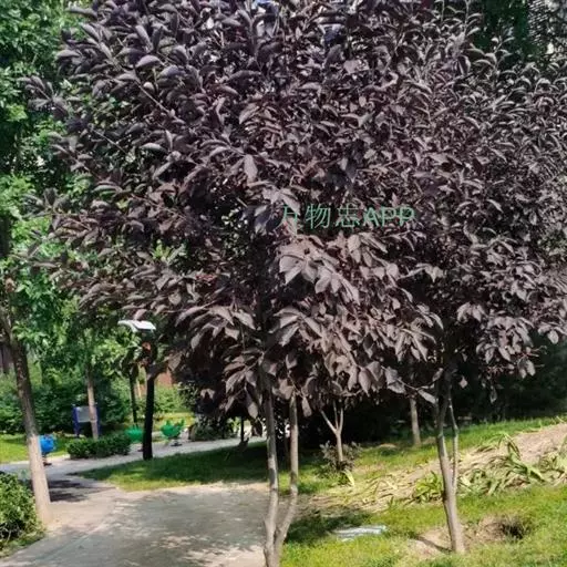 紫叶稠李是一种高大落叶乔木。高度可达到15米,冠幅5米。叶片初生为绿色。叶片有光泽。进入5月后随着气温升高,逐渐转为紫红色,秋后变为红色,整个生长季节,叶片变色期较长。花期4月底-5月中旬,花白色。果球形,较大,成熟时为紫黑色,果熟期7-8月。 紫叶稠李