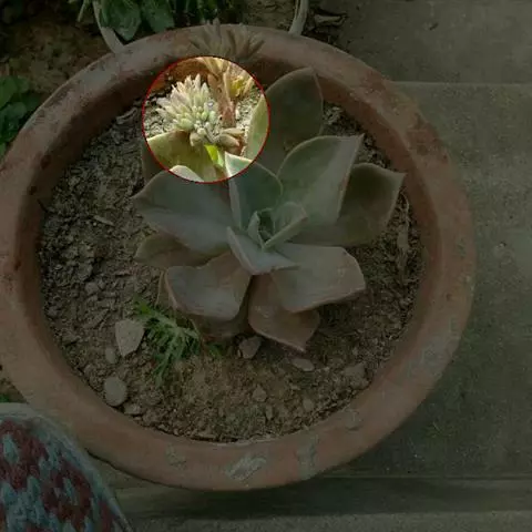 叶子表面宽厚,富肉质感且带有磨纱质感,看像石头质地;开红色小花,生于植株顶部,倒伞形密生,形状像花…