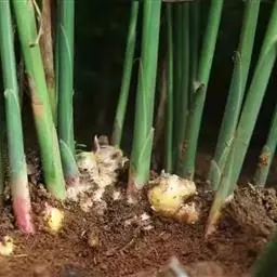 ⑶种姜的采收,一般掌握在地上植株具有4-5片叶片时,大约在6月中下旬进行。采收时小心将植株根际的土壤拨开,取出种姜后再覆土掩盖根部。若采收过迟伤根重影响植株生长。
