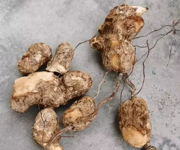 肉质根茎簇生,分生力强,分枝较密成双排列。肉质致密,纤维多,味较辣、品质佳,肉与表皮淡黄色,芽紫红,单株0.75-2公斤,耐旱,抗病。