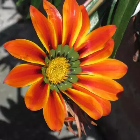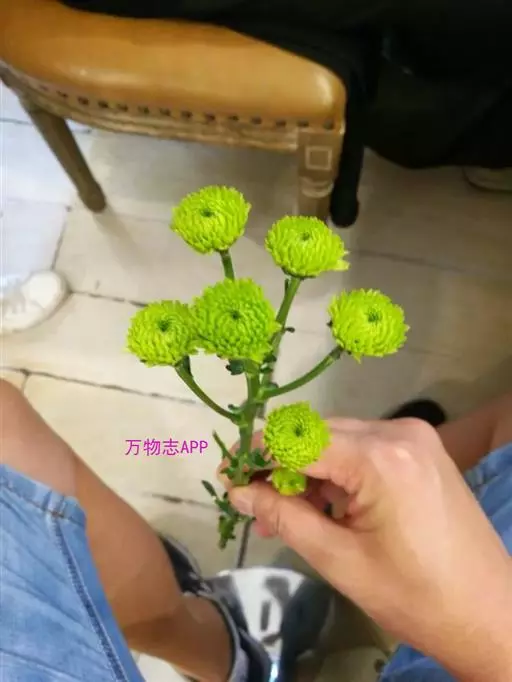 品种性壮:花形飞舞,有的花内瓣 尖端绿色并向花心抱合,形似菊花,花比叶高14厘米。