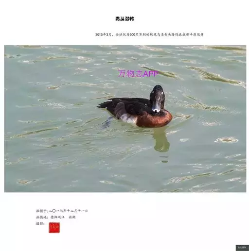 2019年4月中旬,房山区大石河滨水公园首现两只“青头潜鸭”。