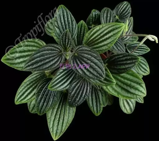 白脉椒草,也叫钻石翡翠,为胡椒科椒草属(也称豆瓣绿属)多年生草本植物,植株易丛生,高20cm~30cm,茎直立生长,红褐色。叶3~4片鸵生,具红褐色短柄,质厚,稍呈肉质,椭圆形,全缘,叶端突起,呈尖形,叶长5cm~8cm左右,宽3cm~5cm,叶色深绿,新叶略呈红褐色,在光照充足条件下尤为明显,叶面有5条凹陷的月牙形白色脉纹。穗状花序细长。