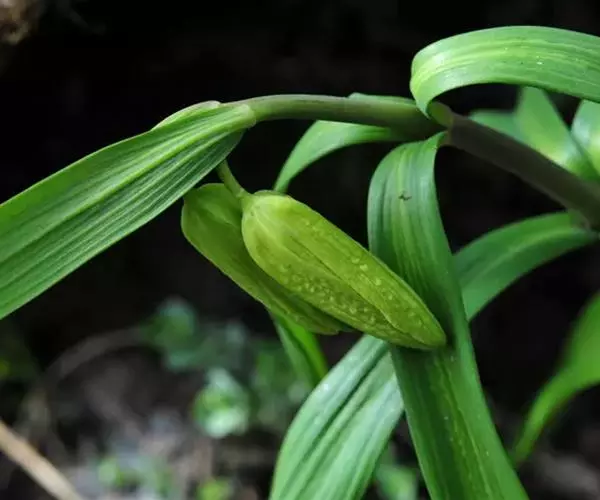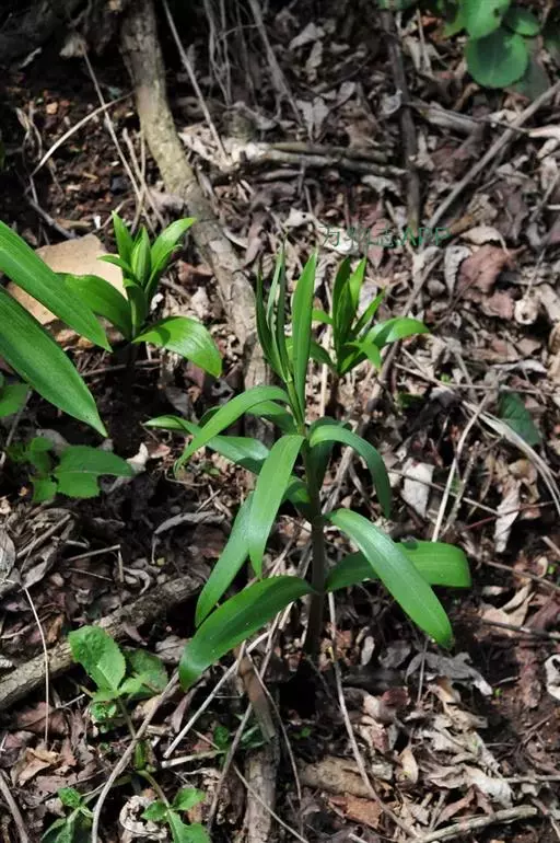 植株长45-60厘米。鳞茎由2枚鳞片组成,直径约2厘米。叶通常对生,有时兼有散生或3叶轮生的,矩圆状披针形至披针形,长10-12厘米,宽1.5-2.8(-4.5)厘米,先端不卷曲。