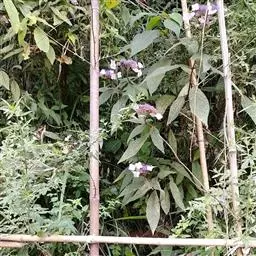 叶纸质,2-3片对生或轮生,卵形或椭圆形,长5-14厘米,宽2-6.5厘米,先端渐尖或急尖,具短尖头,基部圆形或阔楔形,边缘有密集稍内弯的小锯齿,上面无毛或有稀疏糙伏毛,下面于叶脉和侧脉上被紧贴长柔毛;侧脉6-7对,上部微弯,小脉稠密网状,下面明显;叶柄长1-3厘米。