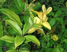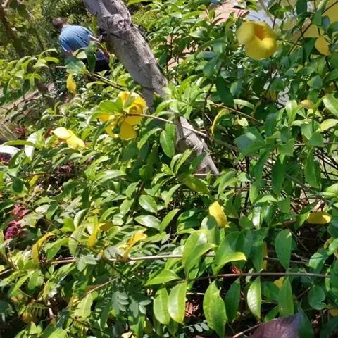 大花软枝黄蝉(Allemanda cathartica Linn. var. hendersonii)是软枝黄蝉的一个变种,夹竹桃科黄蝉属植物。藤状灌木,长达4米,枝条软弯垂,具白色乳汁。叶纸质,椭圆形、卵圆形或倒卵形,花序着花4-5朵,花冠比原变种大形,橙黄色,花冠喉部具5个发亮的斑点,花期春夏两季为盛,有时秋季亦能开花,果期冬季至翌年春季。大花软枝黄蝉原产于南美洲的乌拉圭,现广植于热带和亚热带地区。大花软枝黄蝉喜高温多湿、阳光充足的气候条件,喜肥沃、排水良好的酸性土壤。大花软枝黄蝉的花橙黄色,大而美丽,供观赏用。