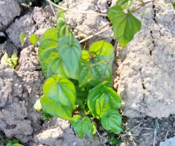 缠绕草质藤本。块茎长圆柱形,垂直生长,长可达1米多,断面干时白色。茎通常带紫红色,右旋,无毛。单叶,在茎下部的互生,中部以上的对生,很少3叶轮生;叶片变异大,卵状三角形至宽卵形或戟形,长3-9(-16)厘米,宽2-7(-14)厘米,顶端渐尖,基部深心形、宽心形或近截形,边缘常3浅裂至3深裂,中裂片卵状椭圆形至披针形,侧裂片耳状,圆形、近方形至长圆形;幼苗时一般叶片为宽卵形或卵圆形,基部深心形。叶腋内常有珠芽。雌雄异株。