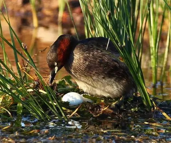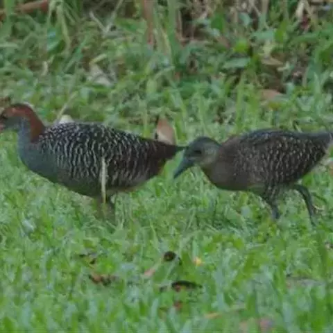 白眉田鸡(图5) 繁殖期各地有所不同:加里曼丹岛是4-6月,菲律宾7-8月,10月出现雏鸟;澳大利亚1-5月,在昆士兰北部9-11月有幼鸟出现。单配制,在非繁殖季节可能仍保持配对关系,可能永久具领域性。巢建在地面的草丛上,或建于沼泽植物中,有时在水深1米的水草丛中,常将周围植物折弯用作巢的天篷,也有建在红树林的树叉上。巢松散扁平,外径约15厘米,深约3.5厘米。通常每窝产卵4枚(范围3-7枚),每天产1枚卵,卵的大小为30毫米×23毫米,两性轮流孵卵,孵化期18天。雏鸟由双亲喂养和照顾约4周,在长出飞羽后很快开始换羽。在澳大利亚每年可产1-2窝。 [2-3]