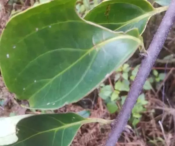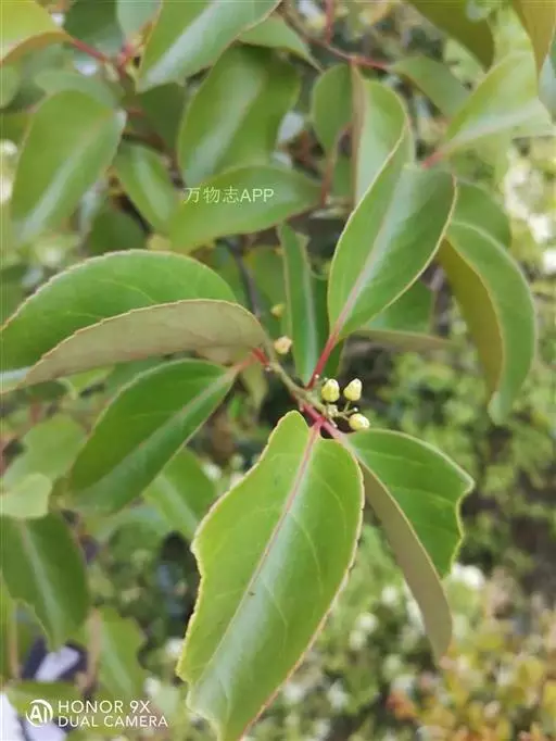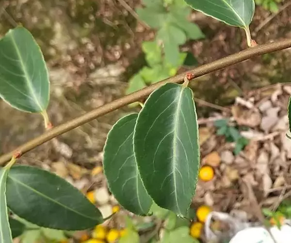 常绿藤本,幼枝褐色,或红棕色,有时被柔毛,小枝无毛,皮孔圆形,稀疏或密布,髓实心,白色;冬芽圆锥形,长2.5毫米,最外两枚芽鳞片特化成三角形刺,以后增大,长可达5毫米。叶片近革质,椭圆形或宽卵状椭圆形,先端急尖,基部楔形或圆形,边缘具疏细锯齿,近基部全缘,侧脉4~5对,网脉不明显,无毛,叶柄长6-2毫米。
