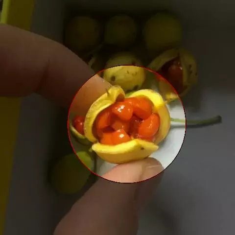 蒴果近球形,直径7-8毫米。种子新月形至 半环形,一端圆钝,另一端略尖,长约4.5毫 米,深褐色,具稠密的扰点,具橙红色假种皮,花期3、4月,果期9 -10月。
