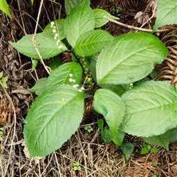 多年生草本,高20-49厘米;根状茎多节,横走,分枝,生多数细长须根,有香气;茎直立,单生或数个 中医中药材 丛生,不分枝,下部节上对生2片鳞状叶。叶对生,通常4片生于茎顶,成假轮生,纸质,宽椭圆形或倒卵形,长8-14厘米,宽5-8厘米,顶端急尖,基部宽楔形,边缘有齿牙状锐锯齿,齿尖有一腺体,近基部或1/4以下全缘,腹面有光泽,两面无毛,侧脉6-8对,网脉明显;叶柄长8-18毫米;鳞状叶膜质,三角形或宽卵形,长4-5毫米。穗状花序单一,顶生,连总花梗长3-5厘米;苞片三角形或近半圆形;花白色;雄蕊3枚,药隔基部连合,着生于子房上部外侧;中央药隔无花药,两侧药隔各有1个1室的花药;药隔延伸成线形,长约5毫米,水平伸展或向上弯,药室在药隔的基部;子房卵形,无花柱,柱头截平。核果近球形或倒卵形,长2.5-3毫米,具长1-1.5毫米的柄,绿色。花期4-5月,果期5-7月。