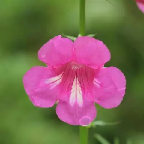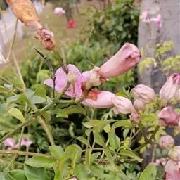 花萼钟状,绿色或紫红色,具深紫色斑点,长12-18毫米,萼齿三角形,长6-12毫米,宽5-7毫米。花冠红色或紫红色,长3.5-4厘米,直径约2厘米,花冠筒外面紫色,具黑色斑点,内面具少数紫色条纹,裂片圆形,长1.7-2.8厘米,宽2-3.9厘米,顶端微凹,具腺体。雄蕊4,2强,着生于花冠筒基部,花药两两靠合;退化雄蕊小,弯曲。子房长圆形,2室,每室胚珠2列,花柱长达4厘米,柱头扇形。