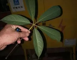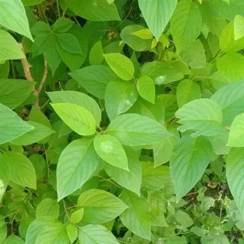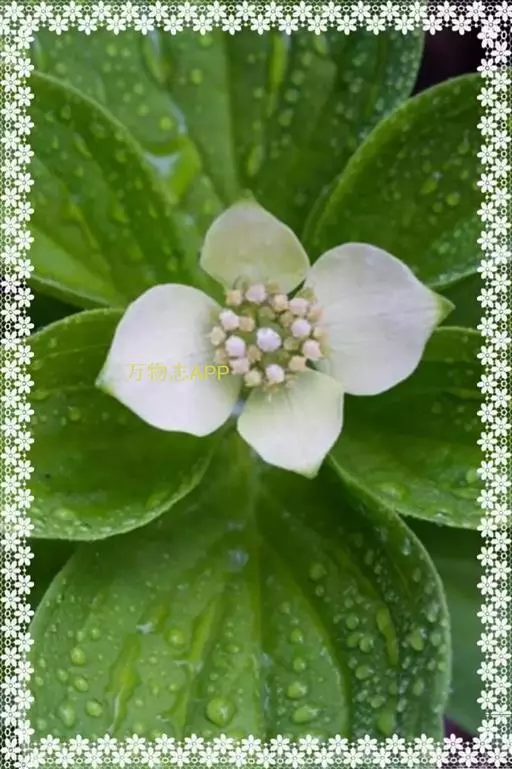 叶对生或6枚于枝顶近于轮生,纸质,倒卵形至菱形,长4-4.8厘米,宽1.7-2.2厘米,先端突尖,基部渐窄,全缘,上面绿色,有少数白色平贴短柔毛,下面淡绿色,疏被白色细伏毛,中脉在上面稍凸起,下面凸出,侧脉3对,于近缘处向内弯曲;叶柄短,微扁,长约2-3毫米,淡绿色,近于无毛。伞形状聚伞花序顶生,宽约1.2厘米,被稀疏的白色平贴短柔毛;总花梗细圆柱形,长约2厘米;总苞片4,白色花瓣状,宽卵形,长0.8-1.2厘米,宽0.5-1.1厘米,先端钝尖,基部突然收缩呈柄状,两面近于无毛,有7条弧形的细脉纹;花小,白绿色,直径约2毫米;花萼管长倒卵形,长约1毫米,密被灰白色平贴短柔毛,上部有裂片4,宽三角形,外侧边缘无毛;花瓣4,卵状披针形,长1.5毫米,向外反折,常有1-2枚花瓣背面的近顶处具1条针状附属物;雄蕊4,长约1毫米,不伸出花外,花药狭卵形,淡黄白色,2室,花丝微扁,白色,无毛;花盘墩状,无毛,低于花萼裂片;花柱圆柱形,长约1毫米,无毛,柱头头状,子房下位,花托长倒卵形,灰绿色;花梗细圆柱形,长1-1.5毫米,近于无毛。核果球形,红色,直径5毫米。花期8月;果期不明。