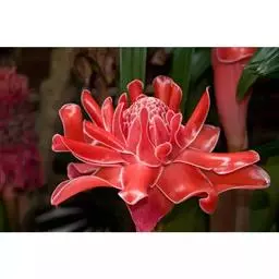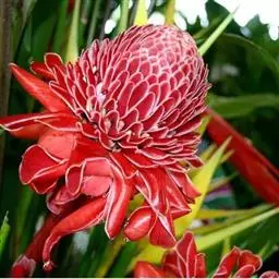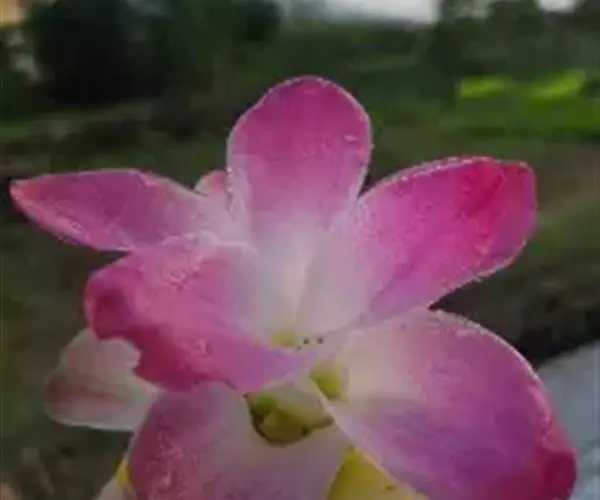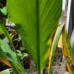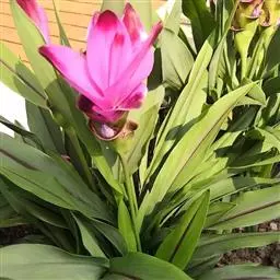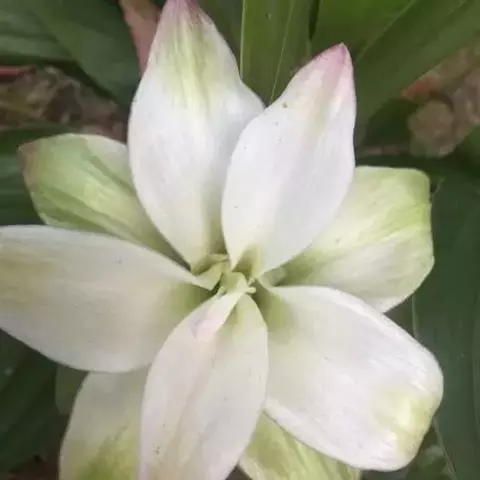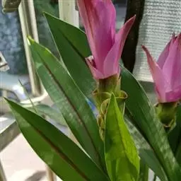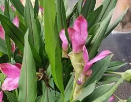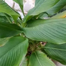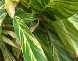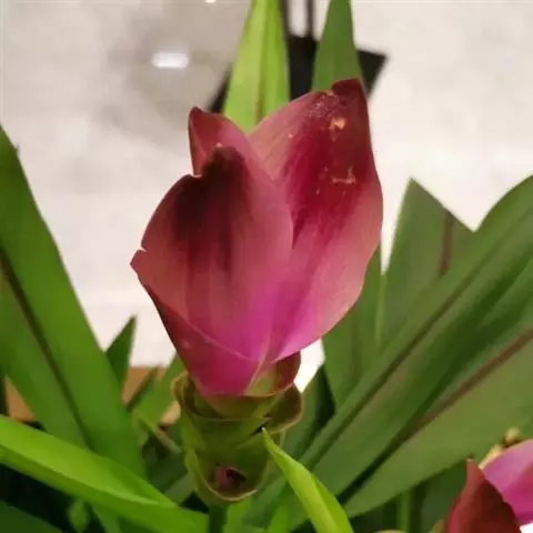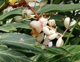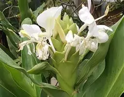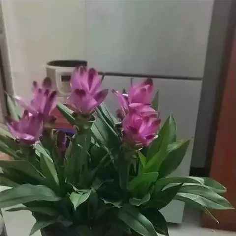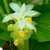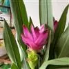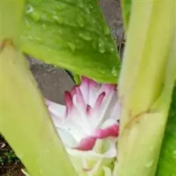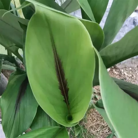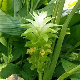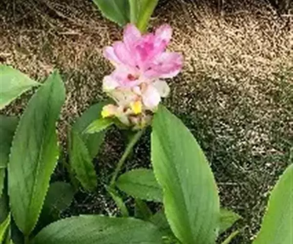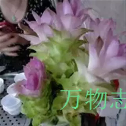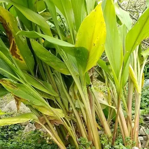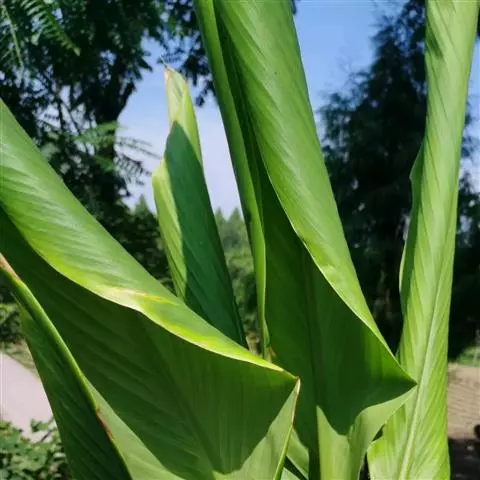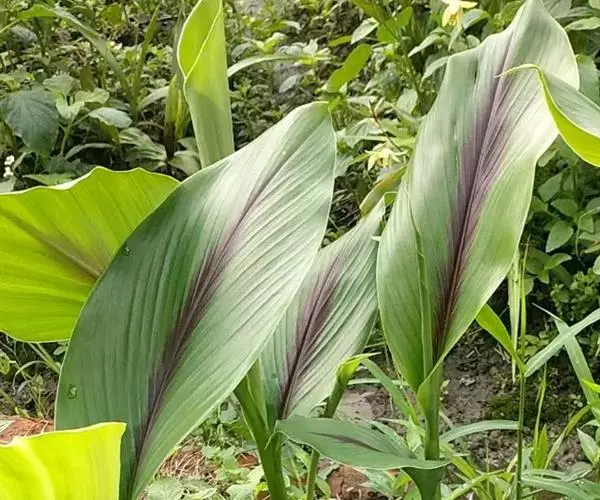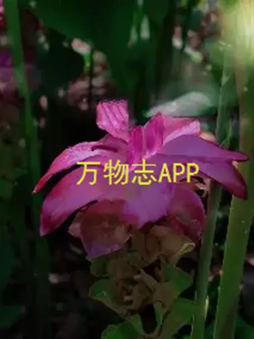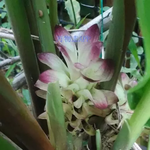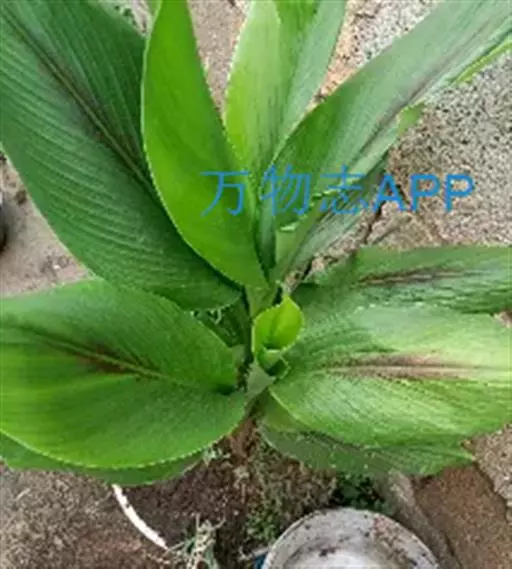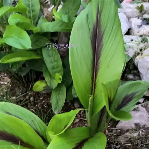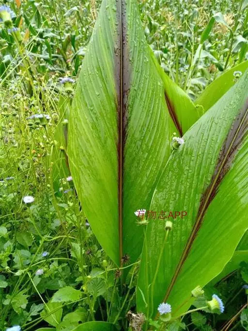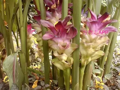 株高约1米;根茎圆柱形,肉质,具樟脑般香味,淡黄色 莪术花 或白色;根细长或末端膨大成块根。叶直立,椭圆状长圆形至长圆状披针形,长25-35(60)厘米,宽10-15厘米,中部常有紫斑,无毛;叶柄较叶片为长。