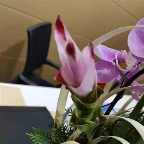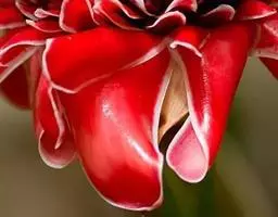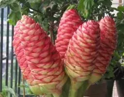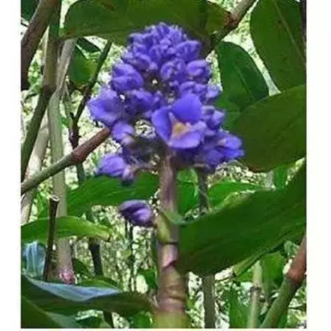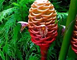 花葶由根茎单独发出,常先叶而生,长10-20厘米,被疏松、细长的鳞片状鞘数枚;穗状花序阔椭圆形,长10-18厘米,宽5-8厘米;苞片卵形至倒卵形,稍开展,顶端钝,下部的绿色,顶端红色,上部的较长而紫色;花萼长1-1.2厘米,白色,顶端3裂;花冠管长2-2.5厘米,裂片长圆形,黄色,不相等,后方的1片较大,长1.5-2厘米,顶端具小尖头;侧生退化雄蕊比唇瓣小;唇瓣黄色,近倒卵形,长约2厘米,宽1.2-1.5厘米,顶端微缺;花药长约4毫米,药隔基部具叉开的距;子房无毛。花期:4-6月。