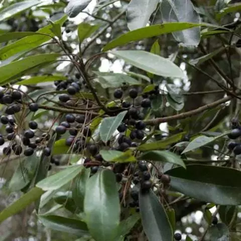 核果卵圆形式卵形,长7-10mm,直径5-6mm。表面蓝黑色,有时附有浅灰色粉末,具不规则皱纹或多数疣状突起,先端有短小2歧的柱头残基,基部有圆点状凹入的果柄痕,有时可见果柄和宿萼。果皮较薄而脆,易碎。种子1粒,棕色或棕黑色,不饱满。气微,味苦。