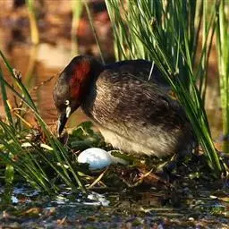 繁殖期5-7月。营巢于有开阔水面的水边芦苇丛和水草丛中。雌雄共同营巢,最早在4月中下旬即见有少数个体开始营巢,大量营巢在5月。巢系就地弯折芦苇或蒲草搭于周围的芦苇或蒲草上作基础,然后堆集一些截成小段的芦苇和蒲草即成,因此巢常常和周围的芦苇、水草搅缠在一起,而不是漂浮在水面,但它可随水面而升降。巢极为简陋,形状似一圆台状,大小据6个巢的测量为外径27-46厘米,内径14-27厘米,高17-35厘米,深4-8厘米,露出水面高度为6-16厘米。1年繁殖1窝,产卵时间较为集中,最早的个体于5月初产卵,大批5月中下旬。1天产卵1枚,每窝产卵7-12枚,常为8-10枚。卵为尖卵圆形或梨形,青灰色、灰黄色或浅灰白色,略带绿色光泽、被有棕褐色斑点,大小据37枚卵的测量为46-58毫米×31-39毫米,平均52毫米×35毫米,重30-45克。孵卵由雌雄亲鸟轮流承担,孵化期24天。雏鸟早成性,刚出壳时体重22-25克,全身被有黑色绒羽,头部具橘黄色绒羽,头顶及眼后有稀疏毛状纤羽,上眼眶呈淡紫蓝色,跗蹠黑色,嘴和额红色,出壳后当天即能游泳。