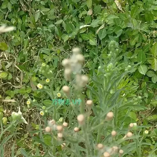 头状花序多数,径约8-10毫米,在茎端排列成总状或总状圆锥花序,花序梗长10-15毫米;总苞椭圆状卵形,长约5毫米,宽约8毫米,总苞片2-3层,线形,顶端尖,背面密被灰白色短糙毛,外层稍短或短于内层之半,内层长约4毫米,宽0.7毫米,具干膜质边缘。花托稍平,有明显的蜂窝孔,径3-4毫米;雌花多层,白色,花冠细管状,长3-3.5毫米,无舌片或顶端仅有3-4个细齿;两性花淡黄色,花冠管状,长约3毫米,管部上部被疏微毛,上端具5齿裂。