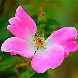 花直径3-4cm;萼筒近圆形,光滑无毛,萼片披针形,先端扩展成叶状,边缘有不整齐锯齿和腺毛,下面有稀疏柔毛和腺毛,上面被柔毛,边缘较密;花瓣粉红色,倒卵形,先端不平整,基部宽楔形;花柱离生,被毛,比雄蕊短很多。