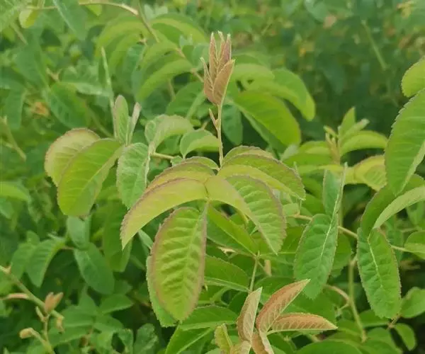 小叶7~9,连叶柄长4~10cm;小叶片长圆形或阔披针形,长1.5~3.5cm米,宽5~15mm,先端急尖或圆钝,基部圆形或宽楔形,边缘有单锯齿和重锯齿,上面深绿色,无毛,中脉和侧脉下陷,下面灰绿色,中脉和侧脉突起,有腺点和稀疏短柔毛;叶柄和叶轴有柔毛、腺毛和稀疏皮刺;托叶大部贴生于叶柄,离生部分卵形,边缘有带腺锯齿,下面被柔毛。花单生于叶腋,或2~3朵簇生;苞片卵形,边缘有腺齿,下面有柔毛和腺点;花梗长5-8mm,无毛或有腺毛;