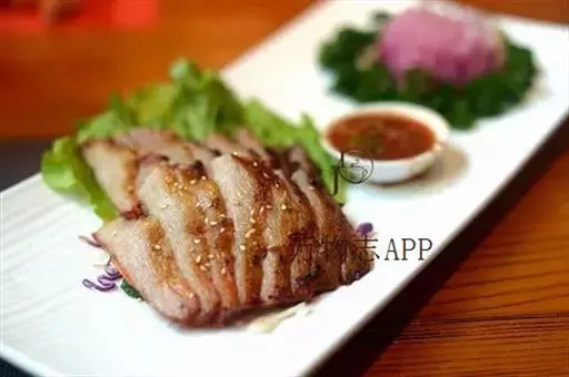 3、将腌好的猪颈肉放入烤炉中小火烤30分钟至熟,取出切成厚0.5厘米的片,摆在垫有生菜