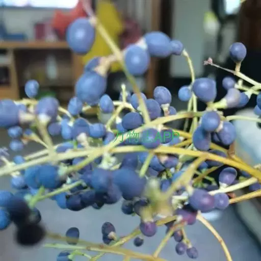 花下垂,1-3朵着生于去年生枝顶叶腋;花梗0.5-1厘米,顶端与萼筒之间无关节,下部有2小苞片,小苞片着生处有关节;萼筒无毛,萼齿4-5,三角状卵形,长约1毫米;花冠绿白色,宽坛状,长约5毫米,4-5浅裂;雄蕊10,比花冠略短,花丝无毛,药室背部有2距。浆果近球形或椭圆形,直径约1厘米,成熟时蓝紫色,被白粉。花期6月,果期7-8月。