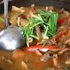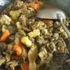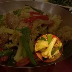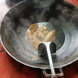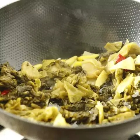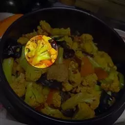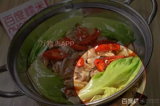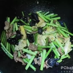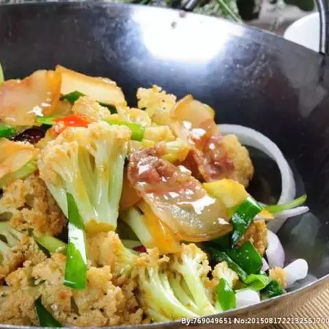 4、然后倒入菜花、高汤翻炒均匀,可少许加上肉片,再加上少许清水,煮8分钟左右;