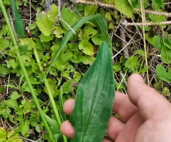 叶大形,稍稀疏,表面鲜绿色,背面带粉兰绿色,基生叶广卵形到椭圆形或披针形,顶端急尖或渐尖,下部楔形或广楔形,并收缩成宽扁有翼的长叶柄,至基部又扩大成叶鞘抱茎,叶片长8-17厘米,宽2.5-5(8)厘米,9-11脉;叶柄常带紫色,长8-12厘米;茎中部叶无柄,卵形或狭卵形,7-9脉;茎上部叶渐小,卵形或广披针形,9-11脉,顶端渐尖,基部心形,抱茎。