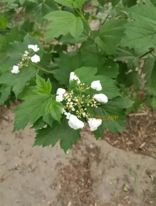 复伞形式聚伞花序直径5-10厘米,大多周围有大型的不孕花,总花梗粗壮,长2-5厘米,无毛,第一级辐射枝6-8条,通常7条,花生于第二至第三级辐射枝上,花梗极短;萼筒倒圆锥形,长约1毫米,萼齿三角形,均无毛;花冠白色,辐状,裂片近圆形,长约1毫米;大小稍不等,筒与裂片几等长,内被长柔毛;雄蕊长至少为花冠的1.5倍,花药黄白色,长不到1毫米;花柱不存,柱头2裂;不孕花白色,直径1.3-2.5厘米,有长梗,裂片宽倒卵形,顶圆形,不等形。果实红色,近圆形,直径8-10(-12)毫米;核扁,近圆形,直径7-9毫米,灰白色,稍粗糙,无纵沟。花期5-6月,果熟期9-10月。